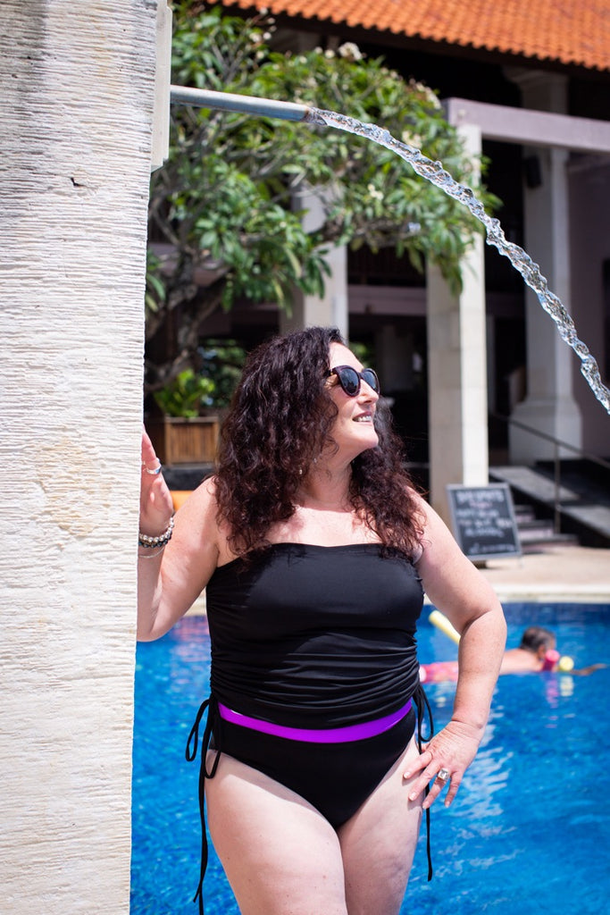Let’s talk about the daring pop of colour at your waist. Not only does it add interest and detail, it draws the eye and creates contrast so you don’t look like a black jellyfish on the beach. The bottoms are ample yet high in the thigh to elongate the leg so you are comfortable and relaxed.