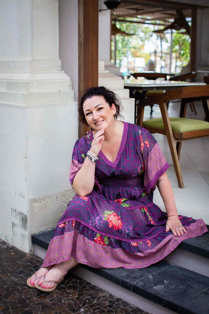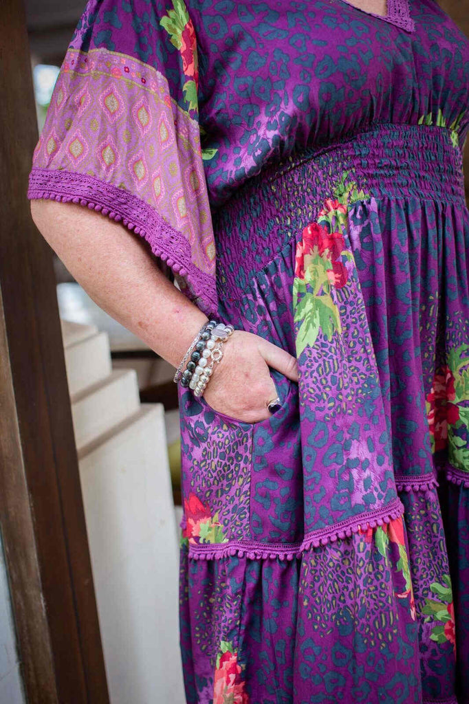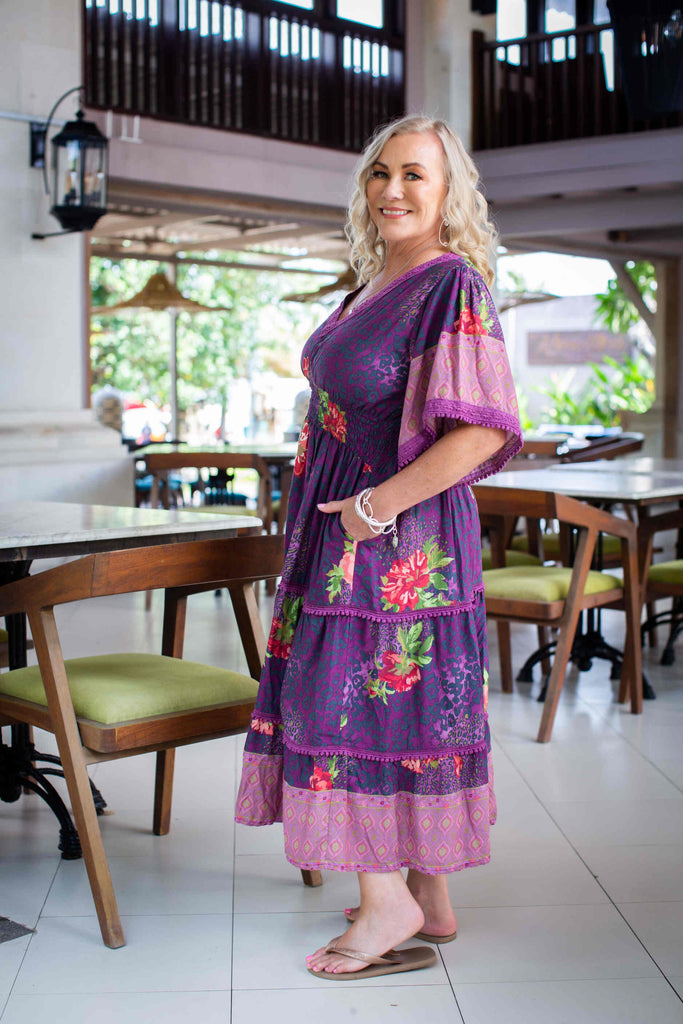 Using this fabric, Janine sat down and played with fabric samples to come up with the launch colour palette of indigo, purple, coral, green and white. The colours all work together in this dress so beautifully. And our entire collection matches in the same way.